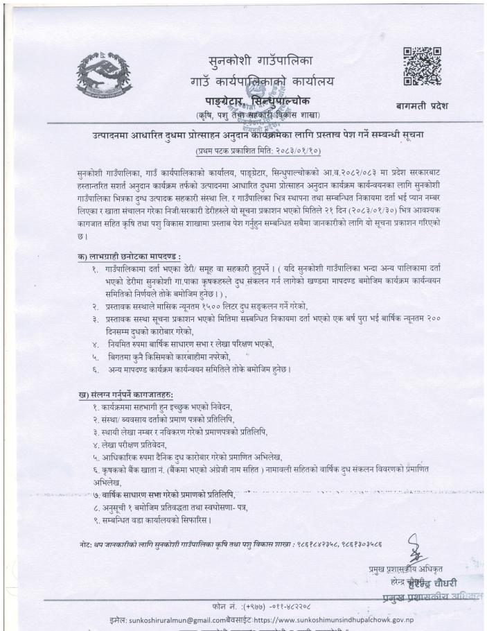 उत्पादनमा आधारित दुधमा प्रोत्साहन अनुदान कार्यक्रमका लागि प्रस्ताब पेश गर्ने सम्बन्धी सूचना