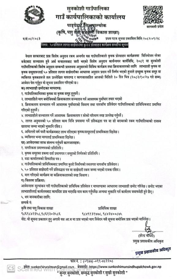 ५० प्रतिशत लागत साझेदारीमा कृषक प्रोत्साहन कार्यक्रम सम्बन्धि सूचना